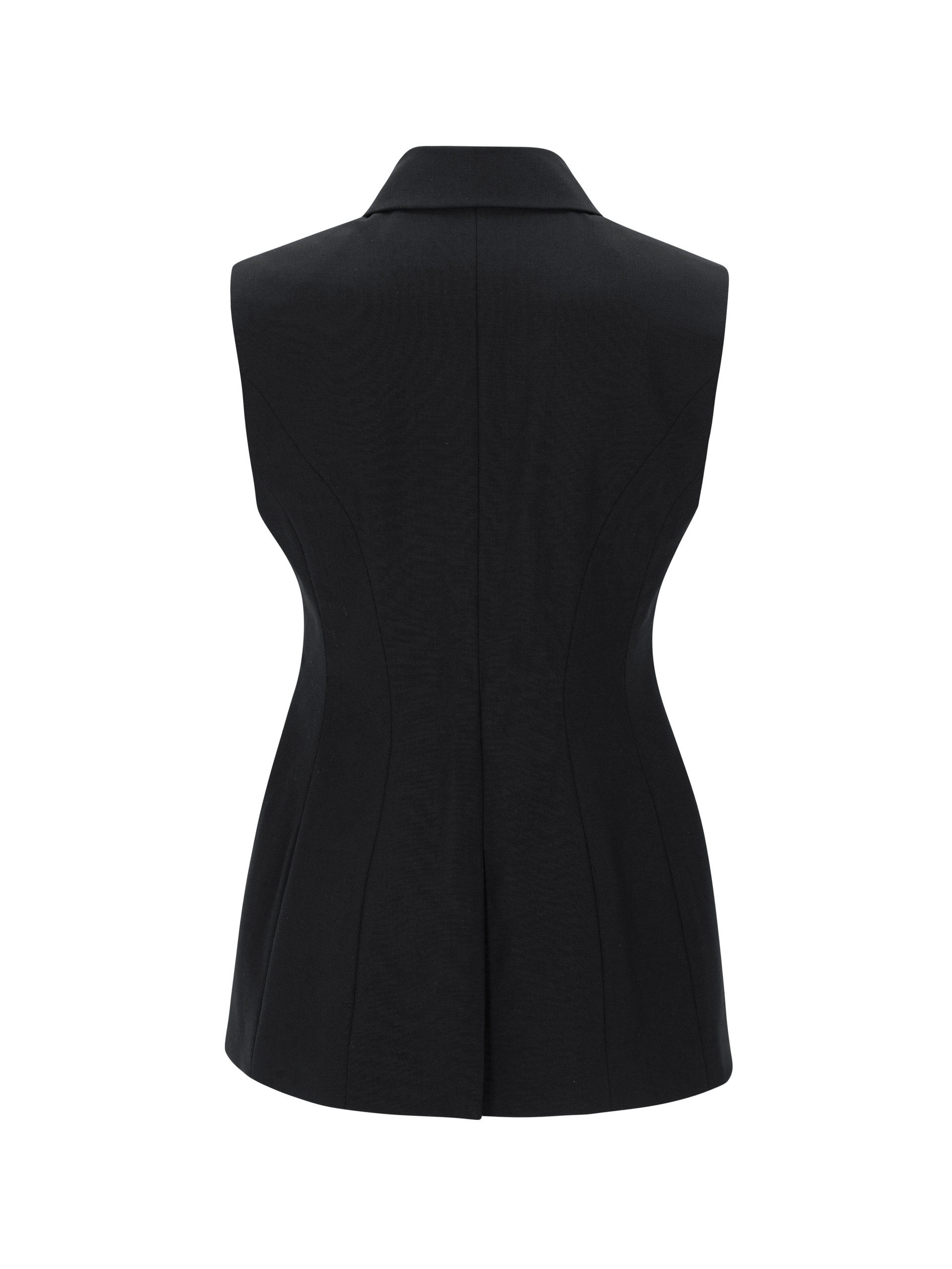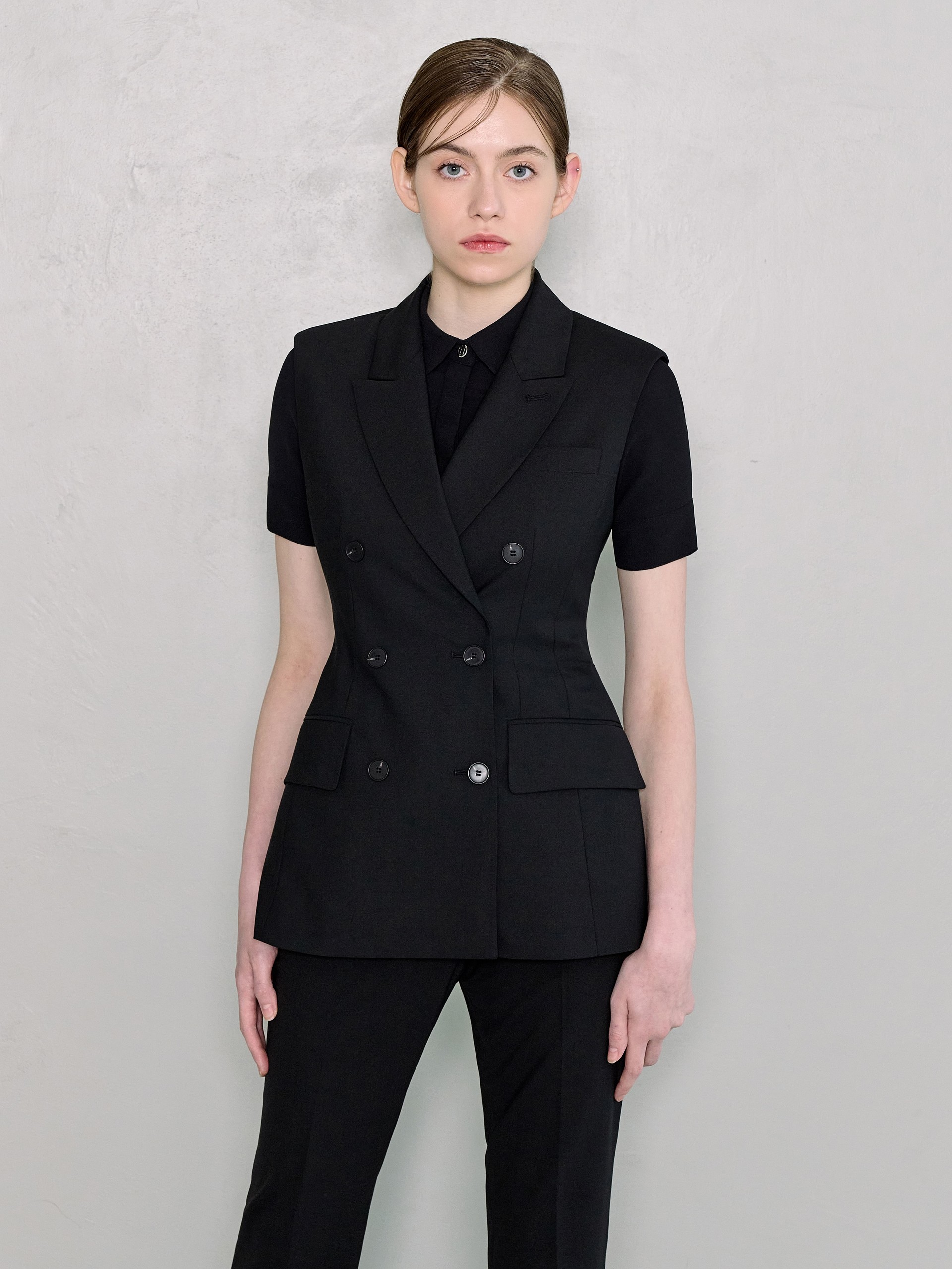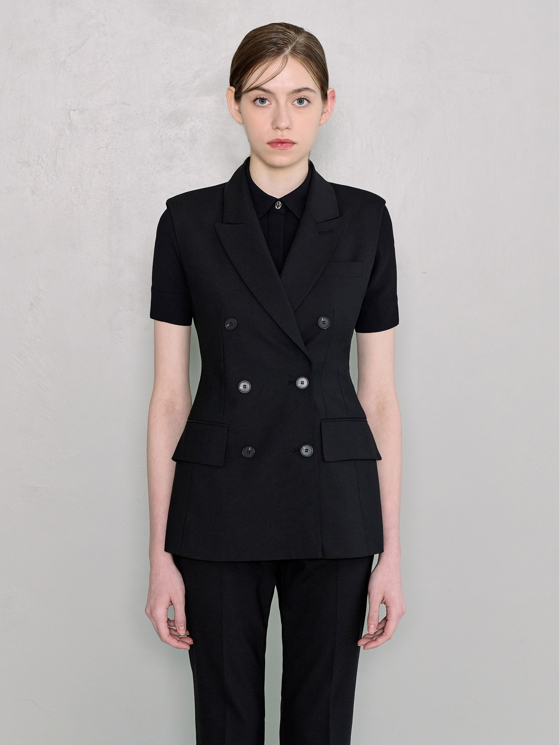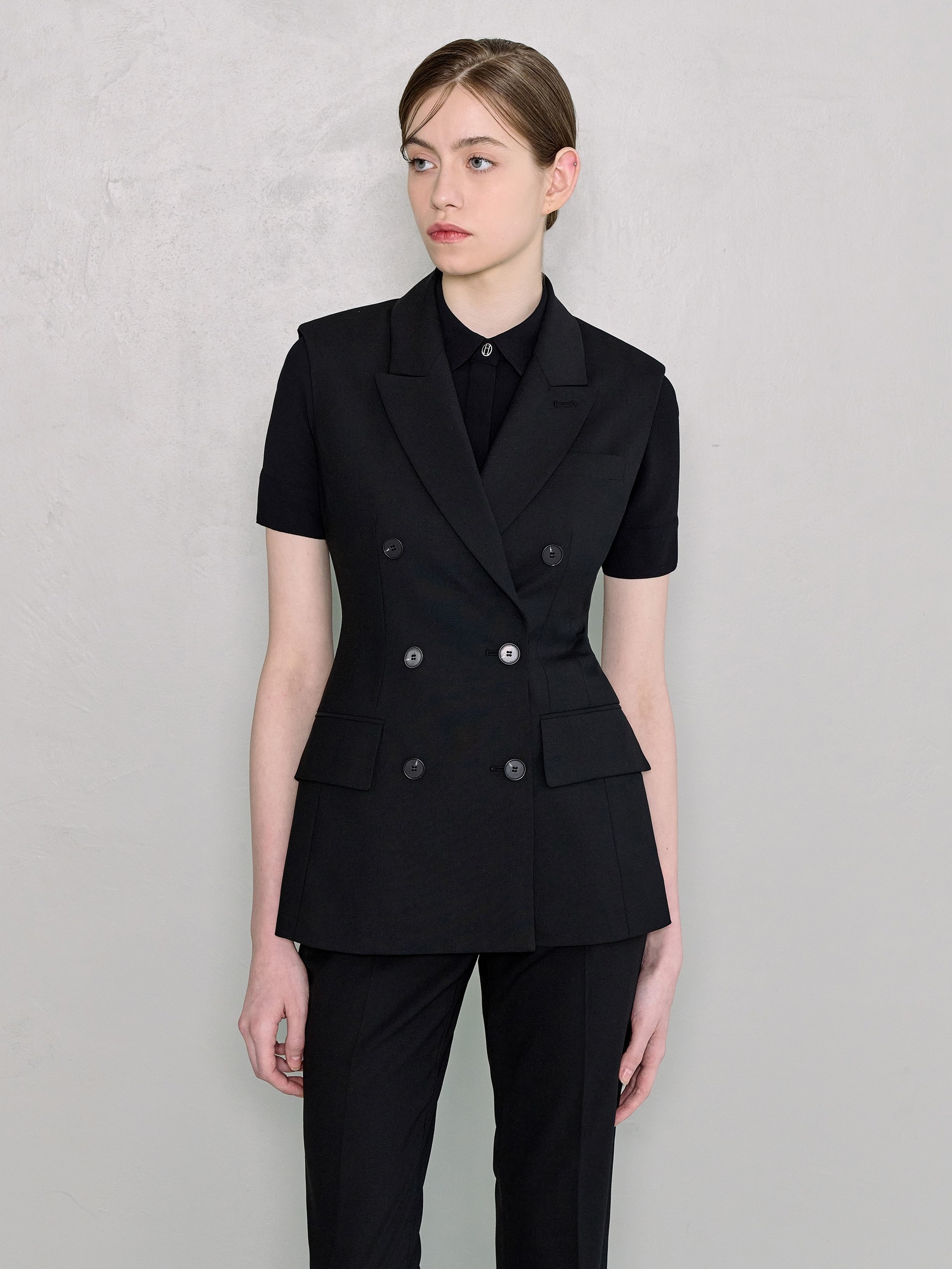 - 더블 여밈의 피크드 카라로 가볍게 착용이 가능한 베스트입니다.