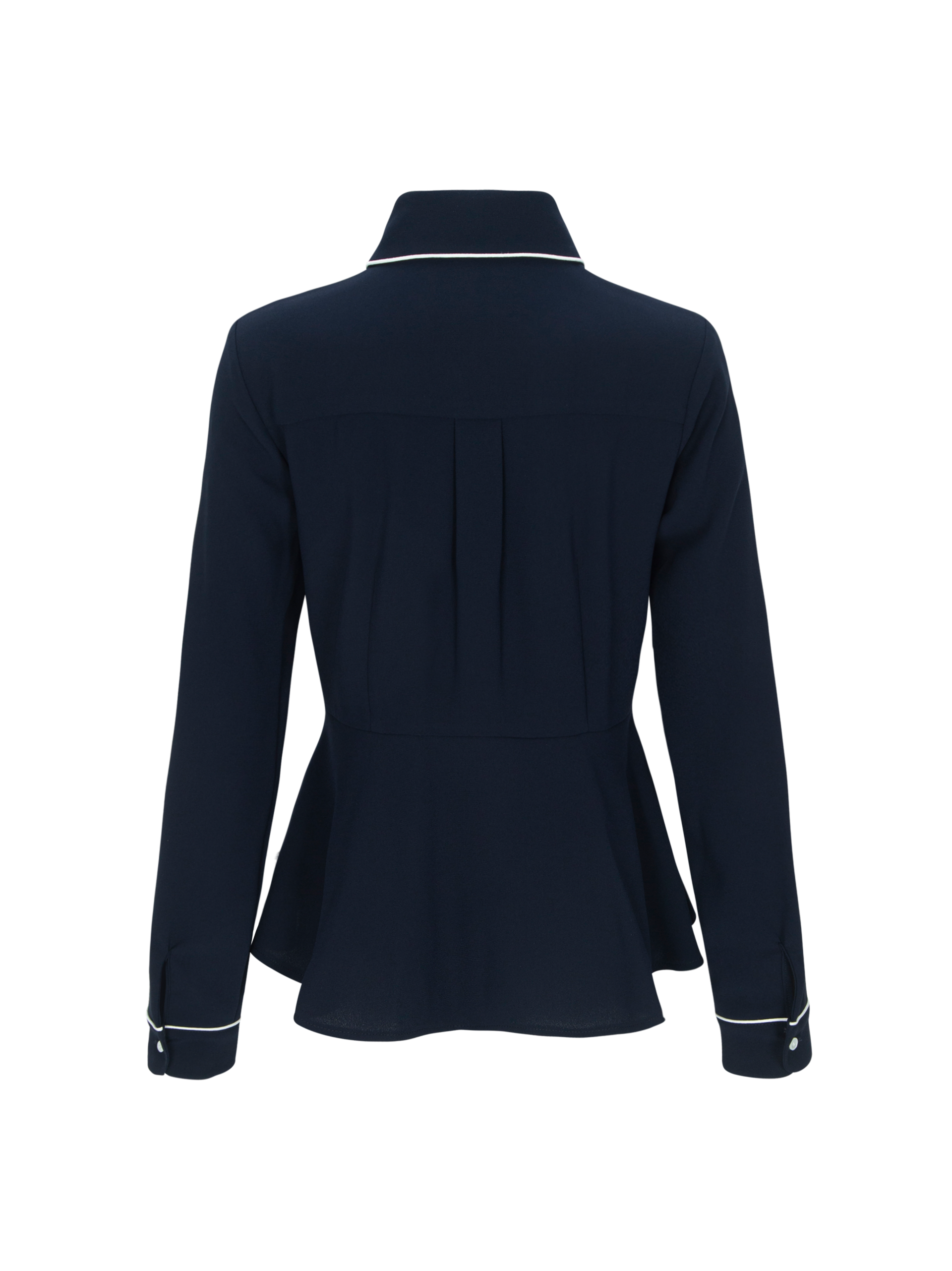 - 리본과 테두리 파이핑으로 장식된 캐주얼한 블라우스입니다.