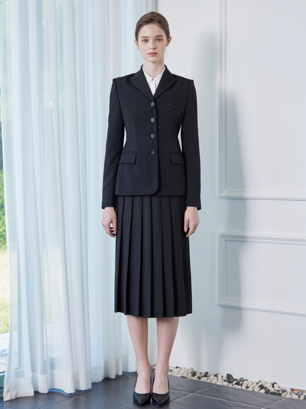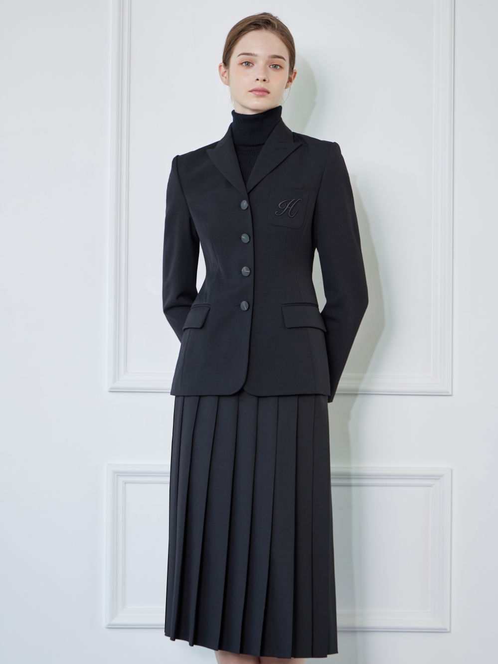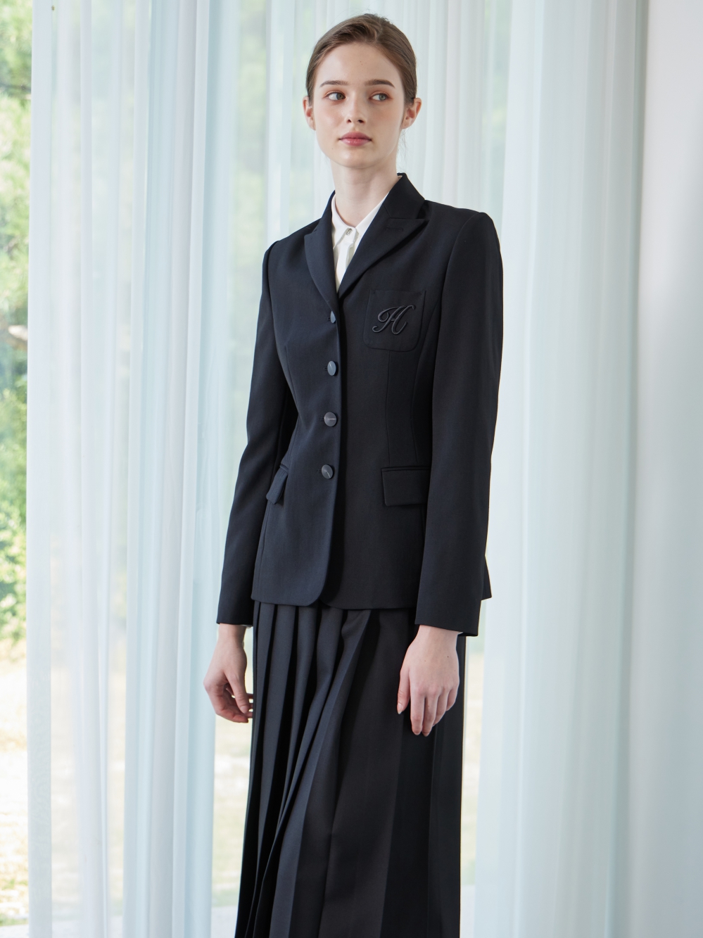 - 왼쪽 가슴의 주머니에 H자수가 있는 세련된 자켓입니다.