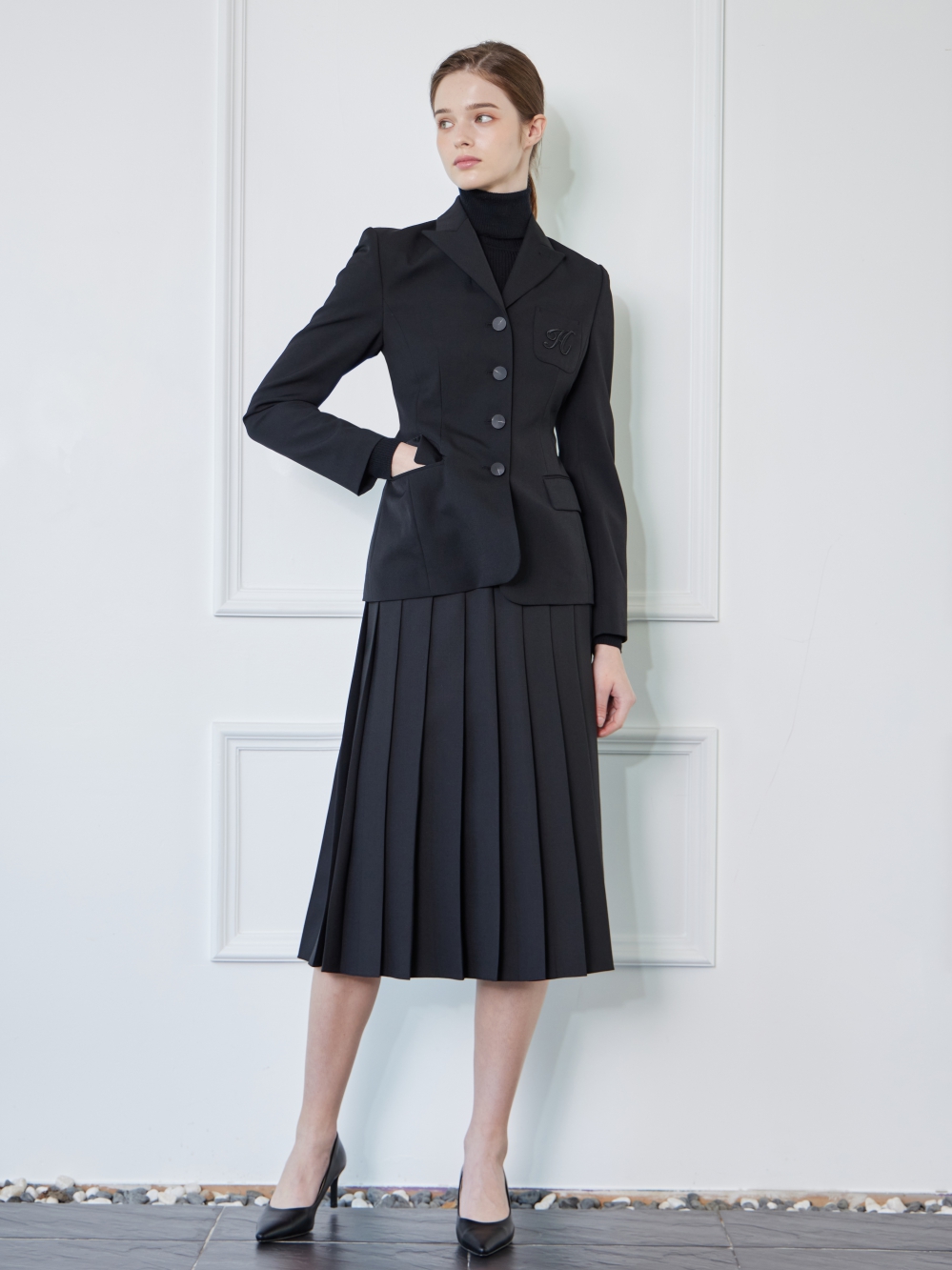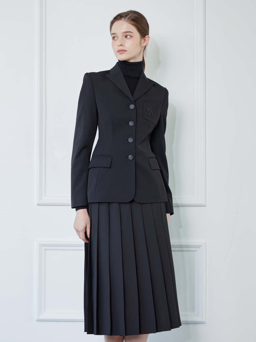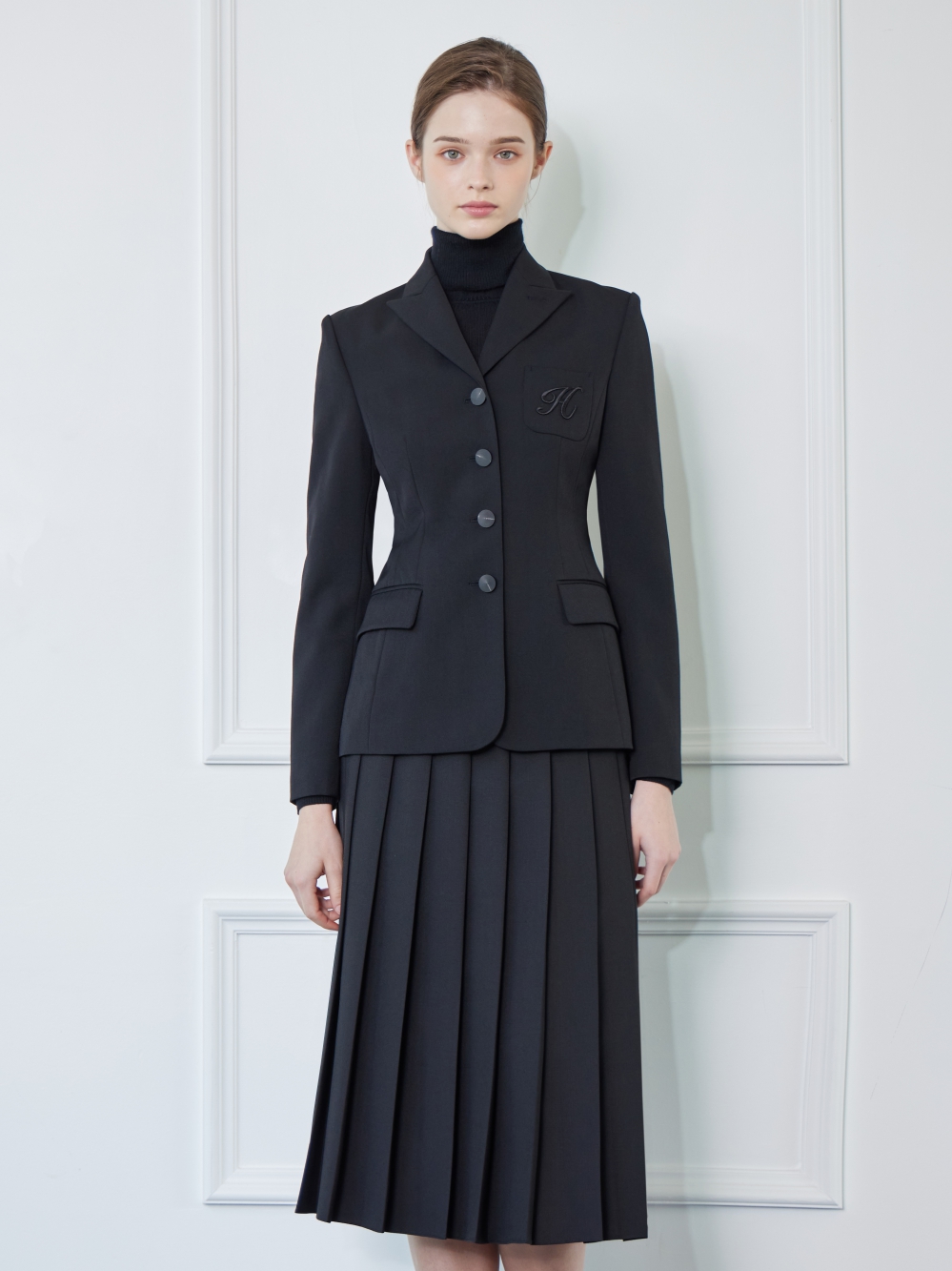 - 왼쪽 가슴의 주머니에 H자수가 있는 세련된 자켓입니다.