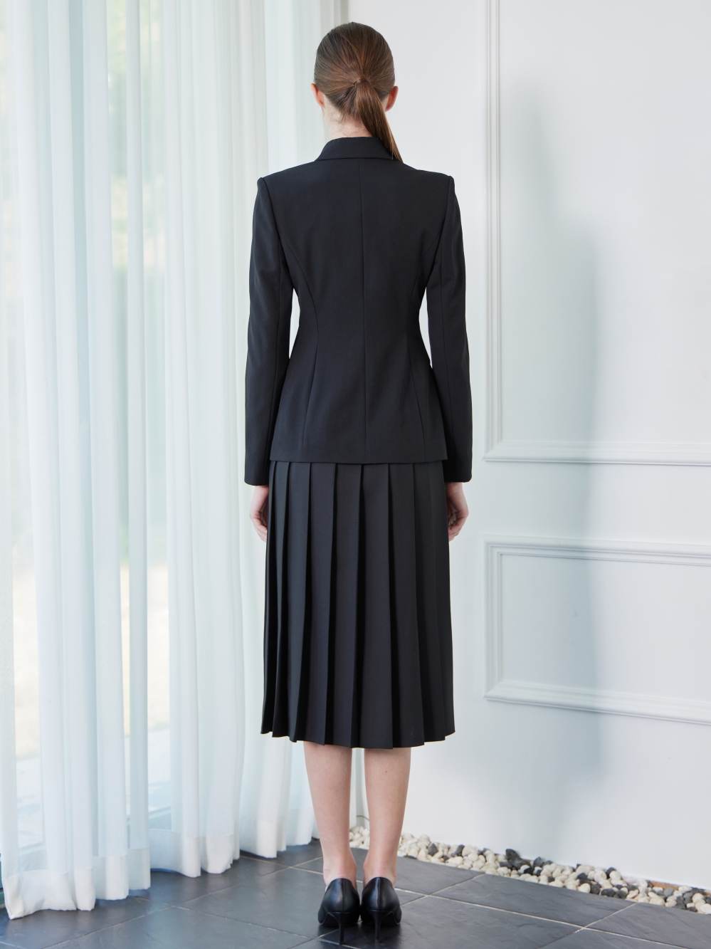 - 원단에 울이 혼용되어 있어 고급스러운 분위기와 품격을 자아내는 의상입니다.