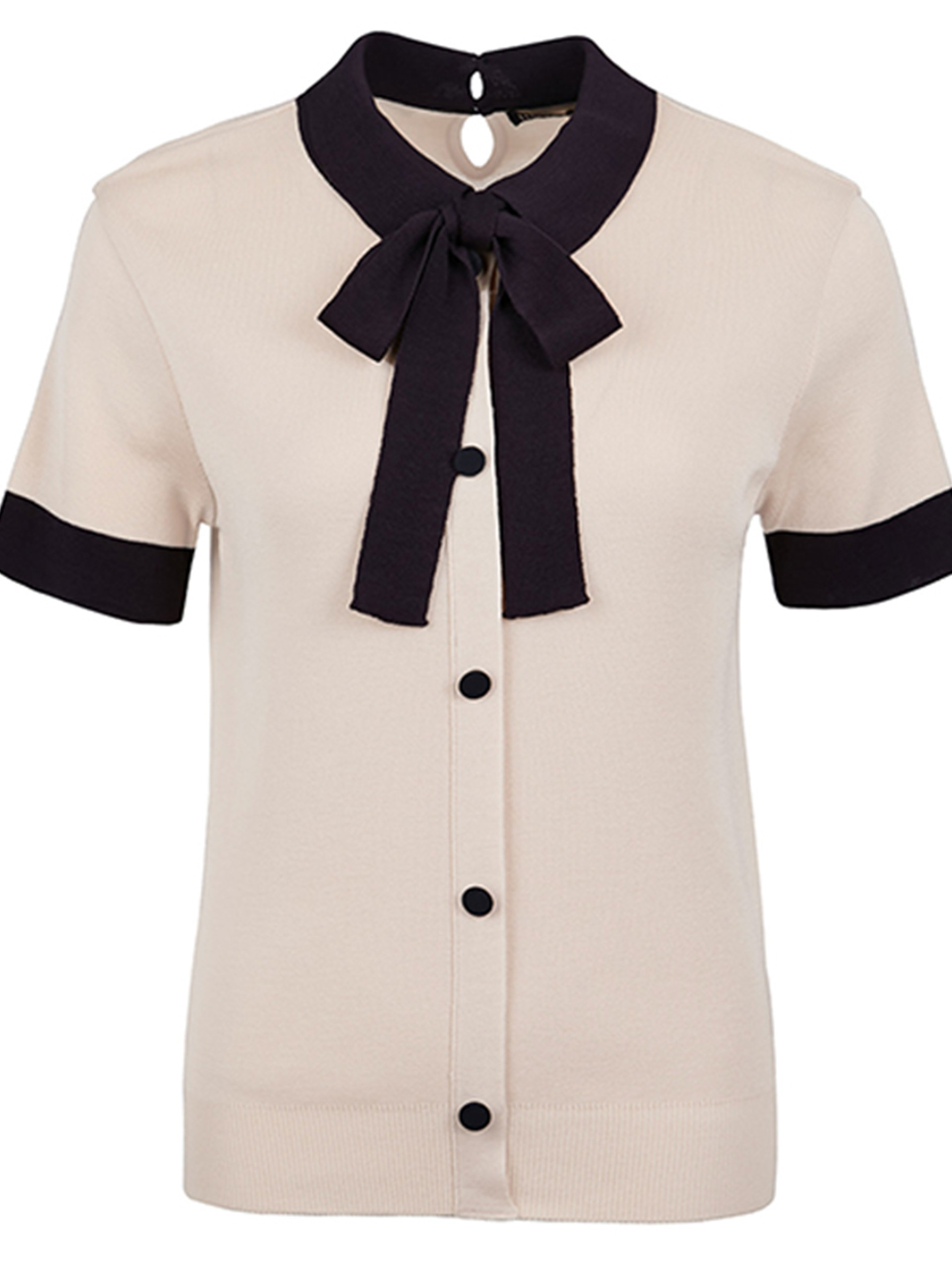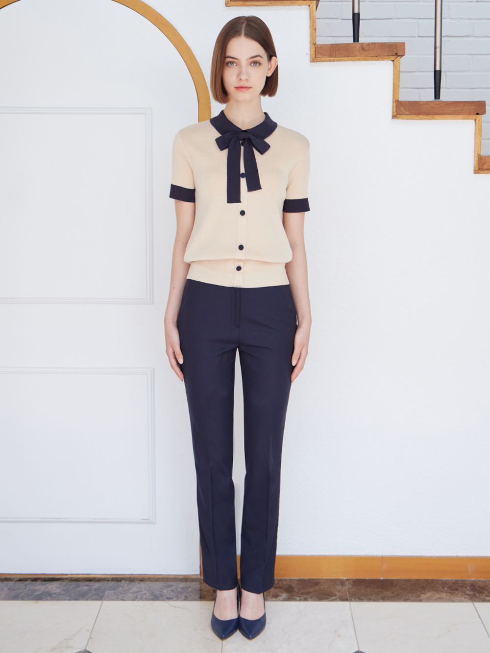 - 배색 리본을 포인트로 카라와 소맷단, 싸개단추 또한 배색을 사용하여 조화롭습니다.