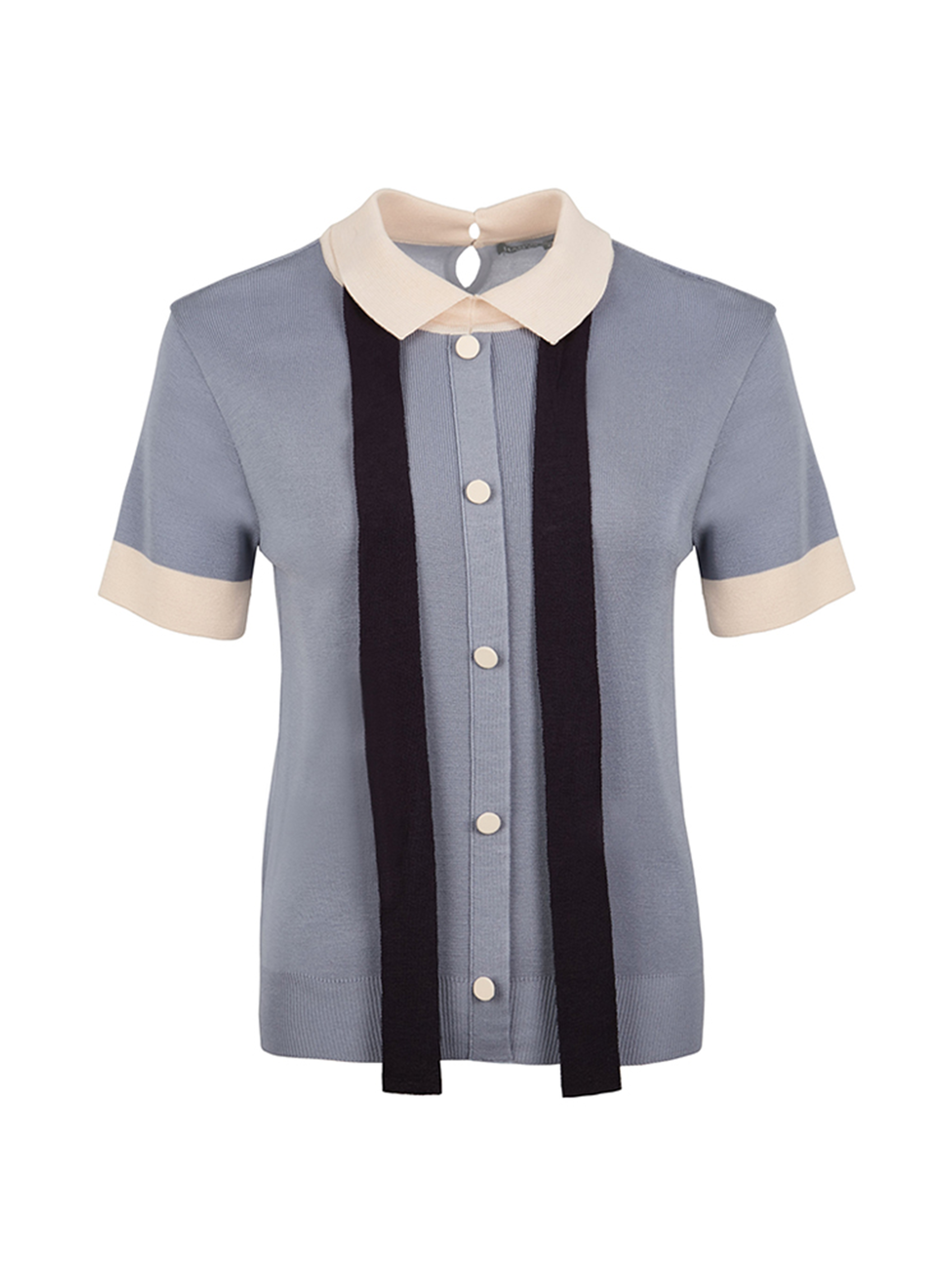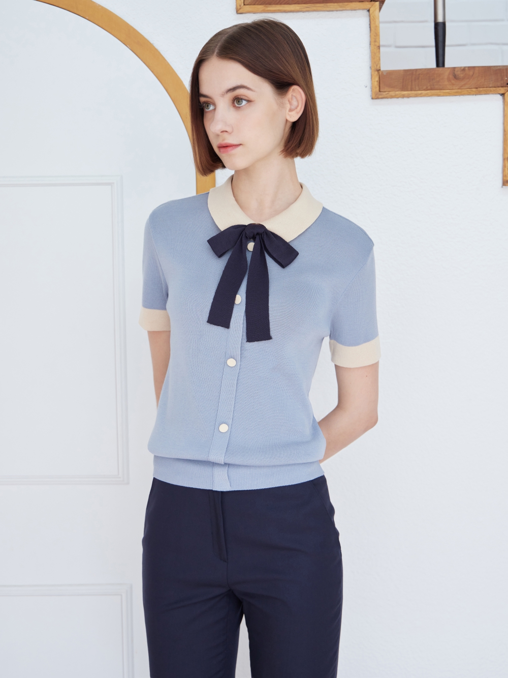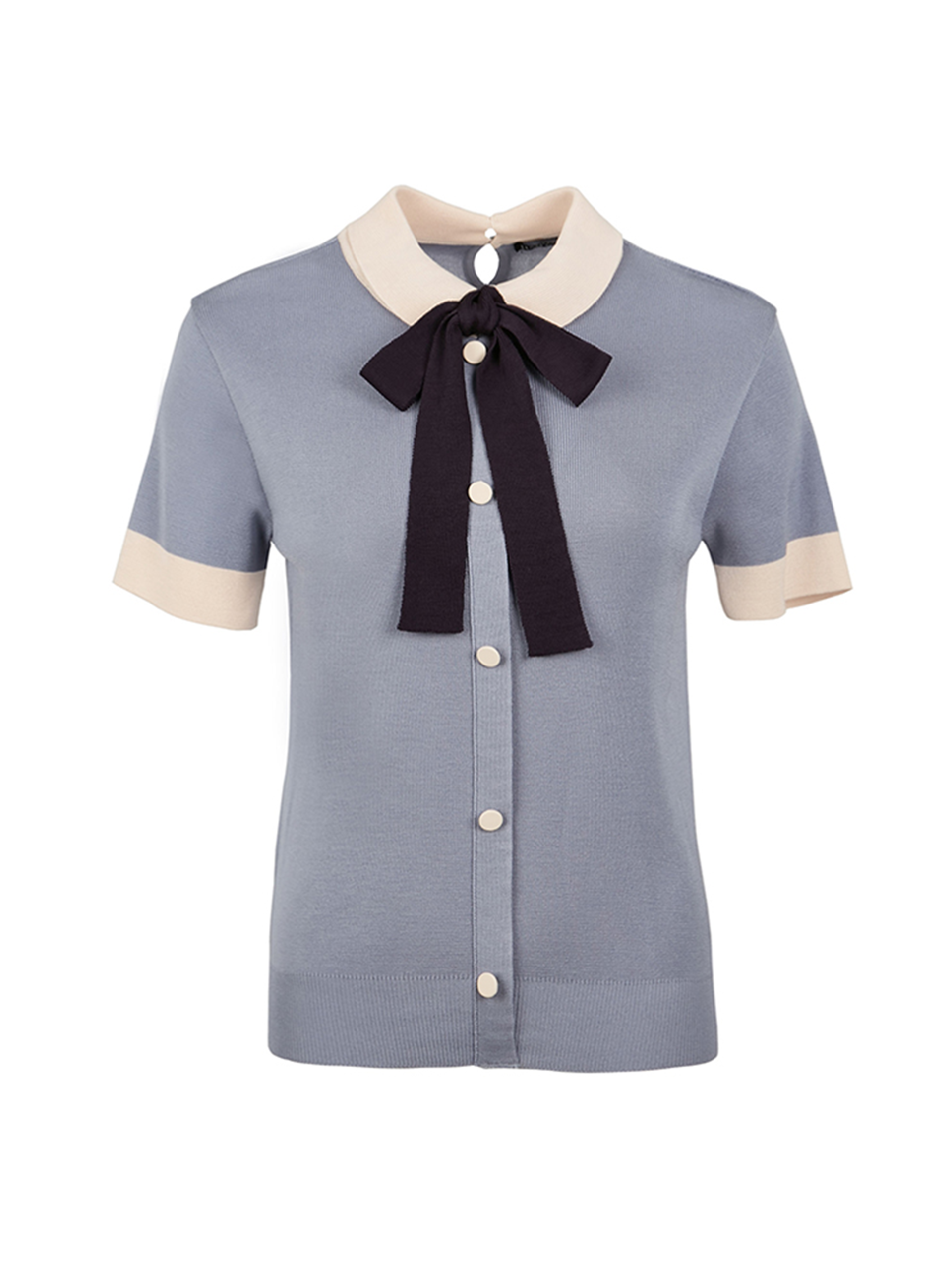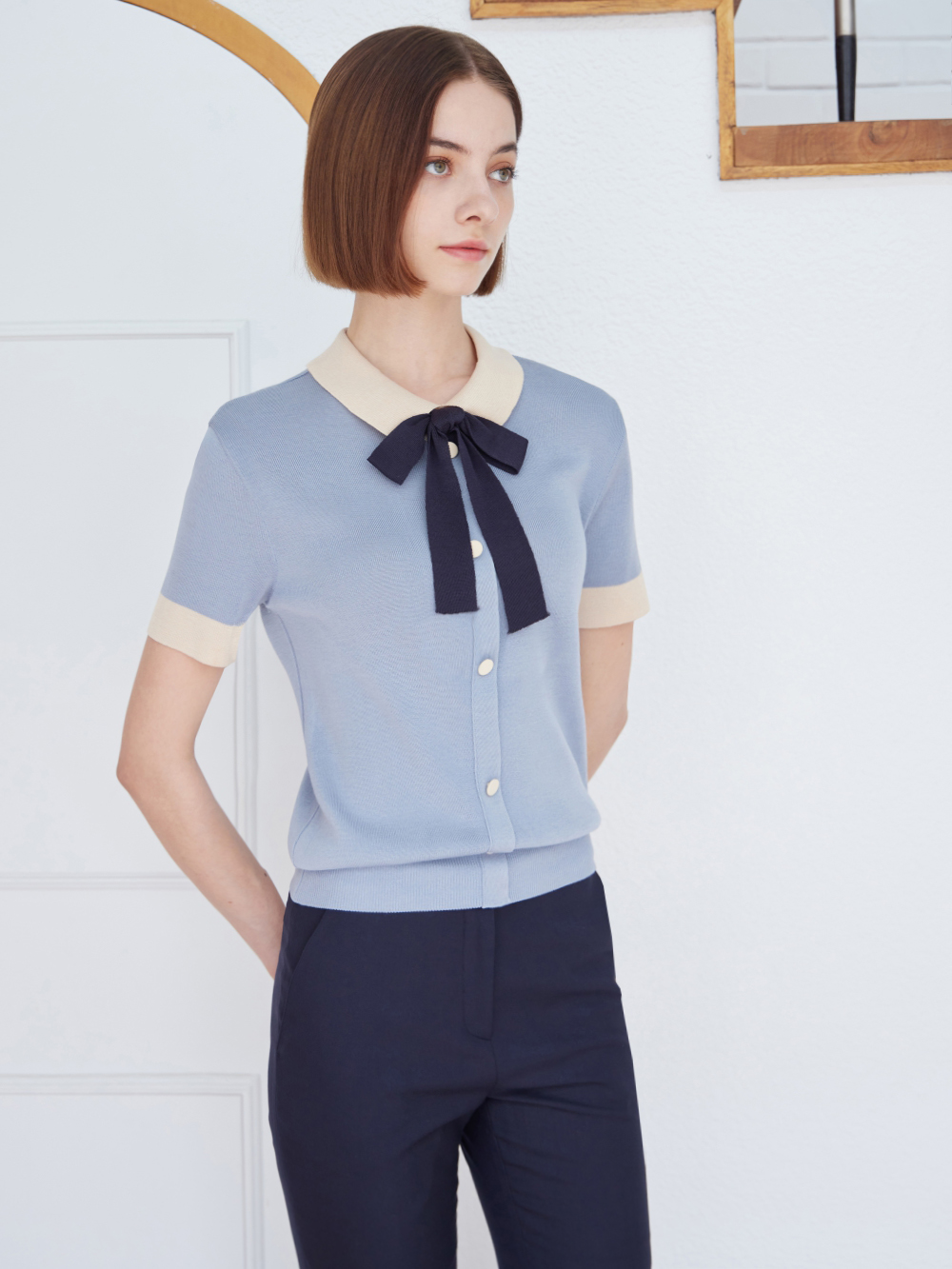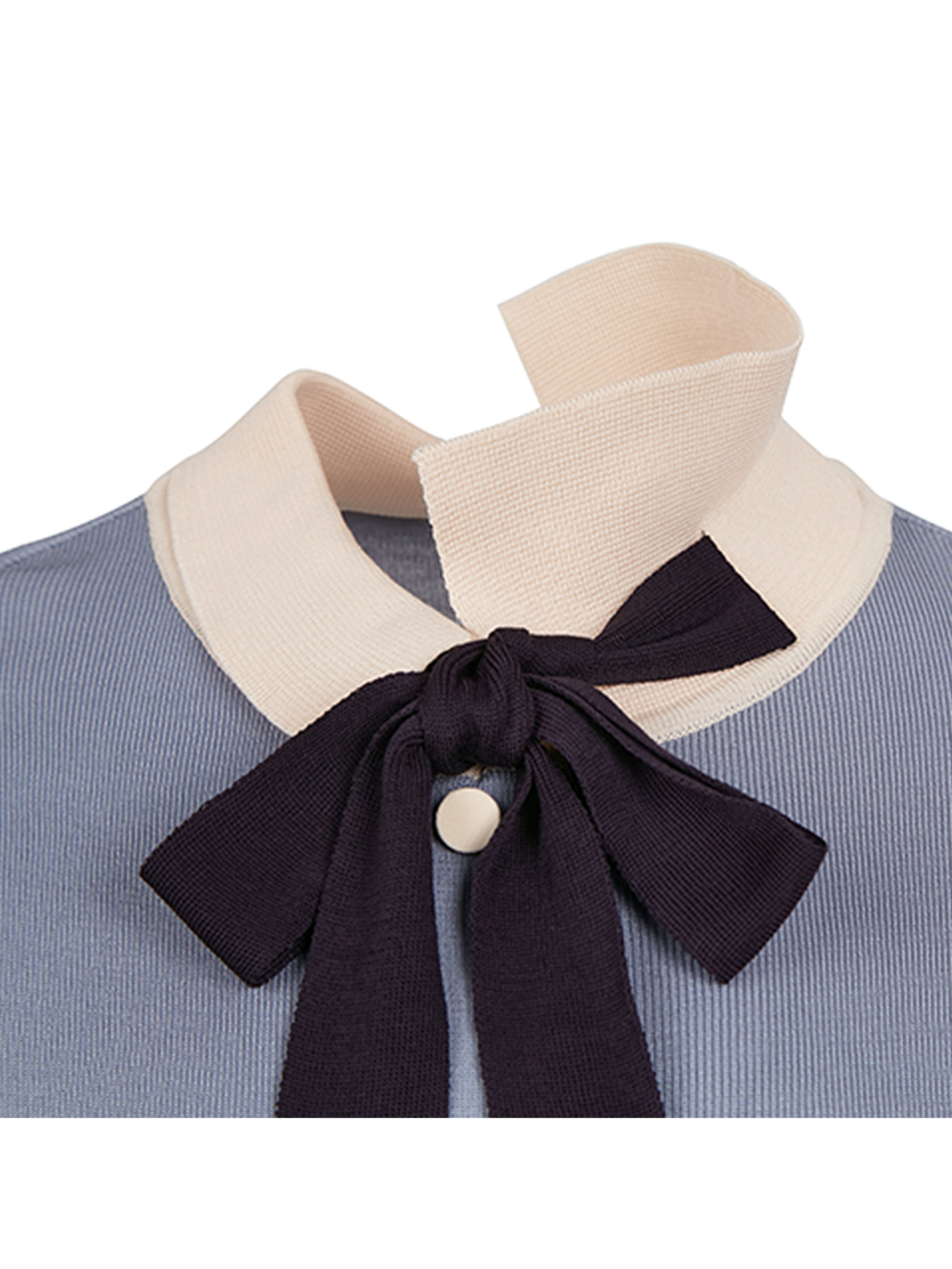 - 배색 리본을 포인트로 카라와 소맷단, 싸개단추 또한 배색을 사용하여 조화롭습니다.