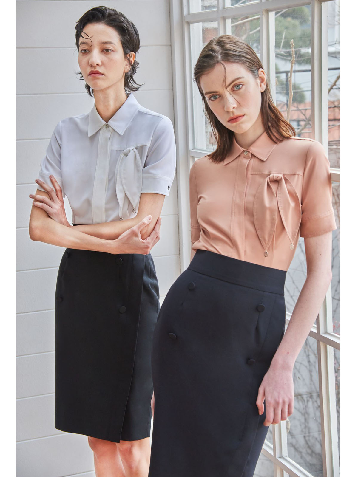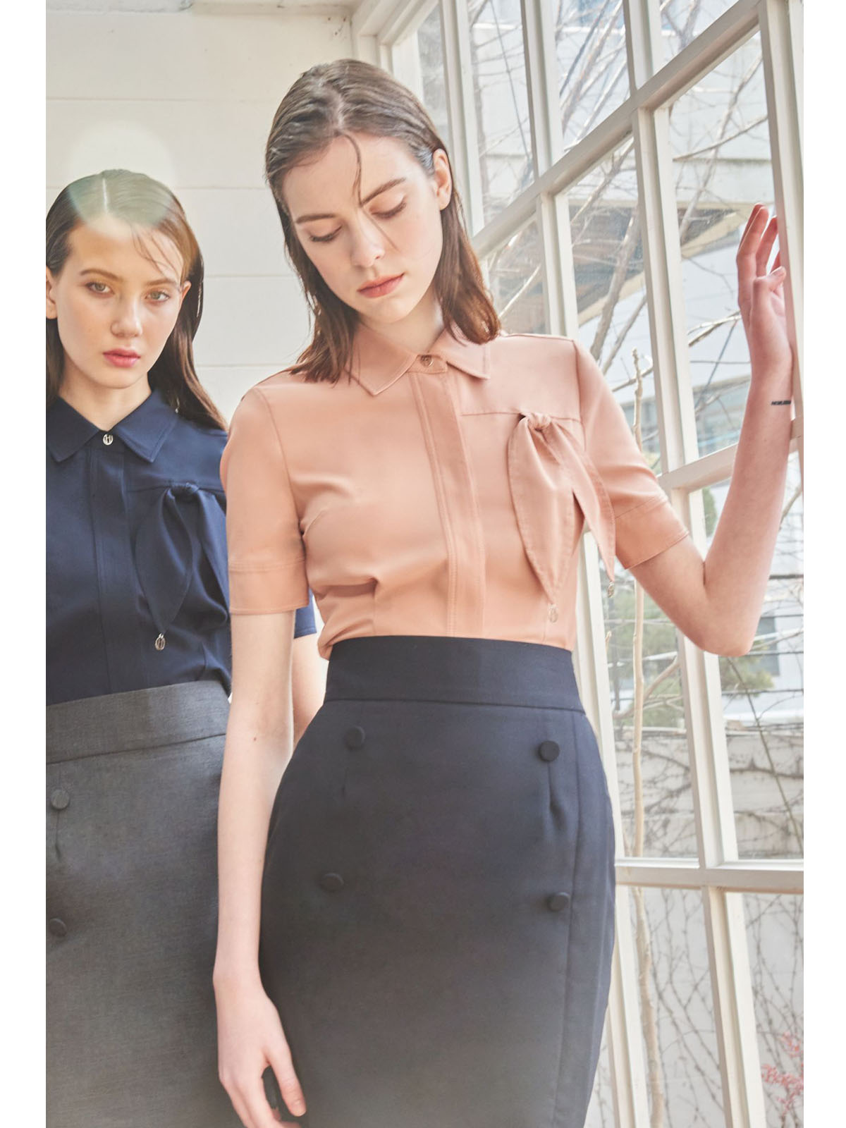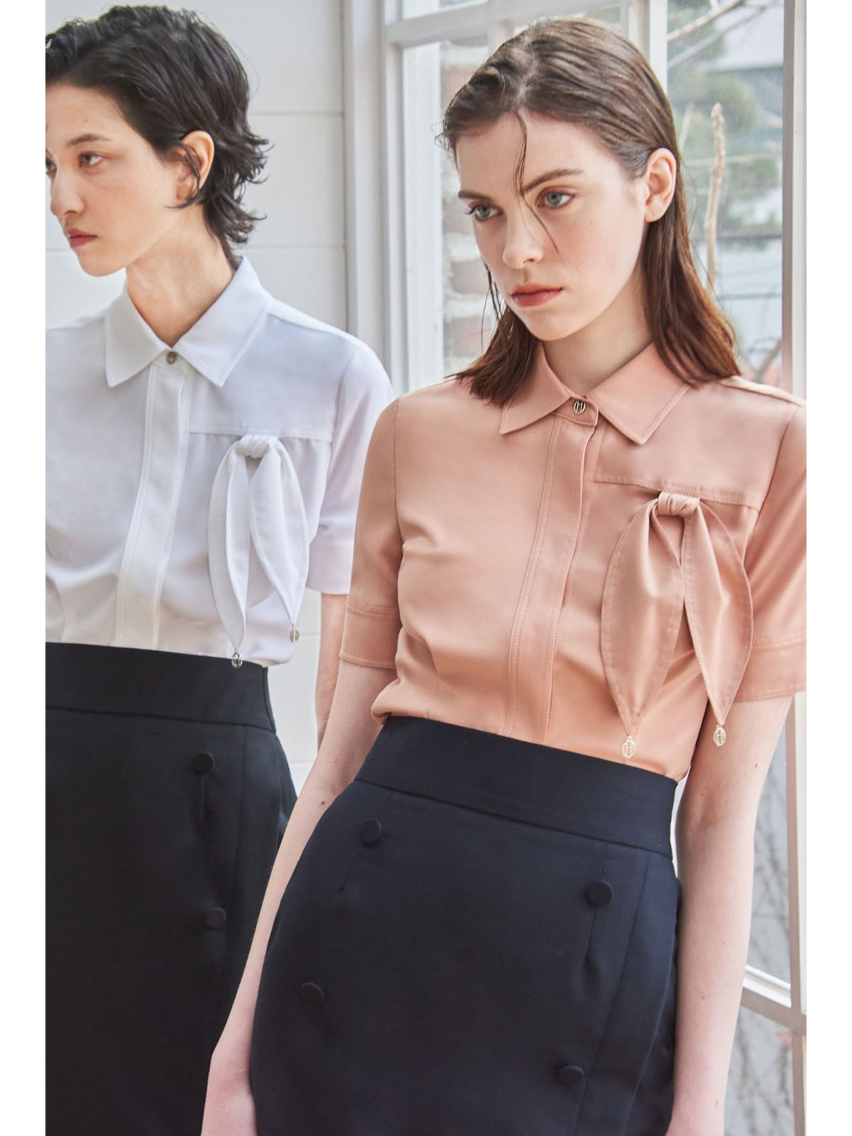 - 가슴 상단의 리본 매듭 디테일이 돋보이는 블라우스로 단독으로 착용하여도 포인트가 됩니다.