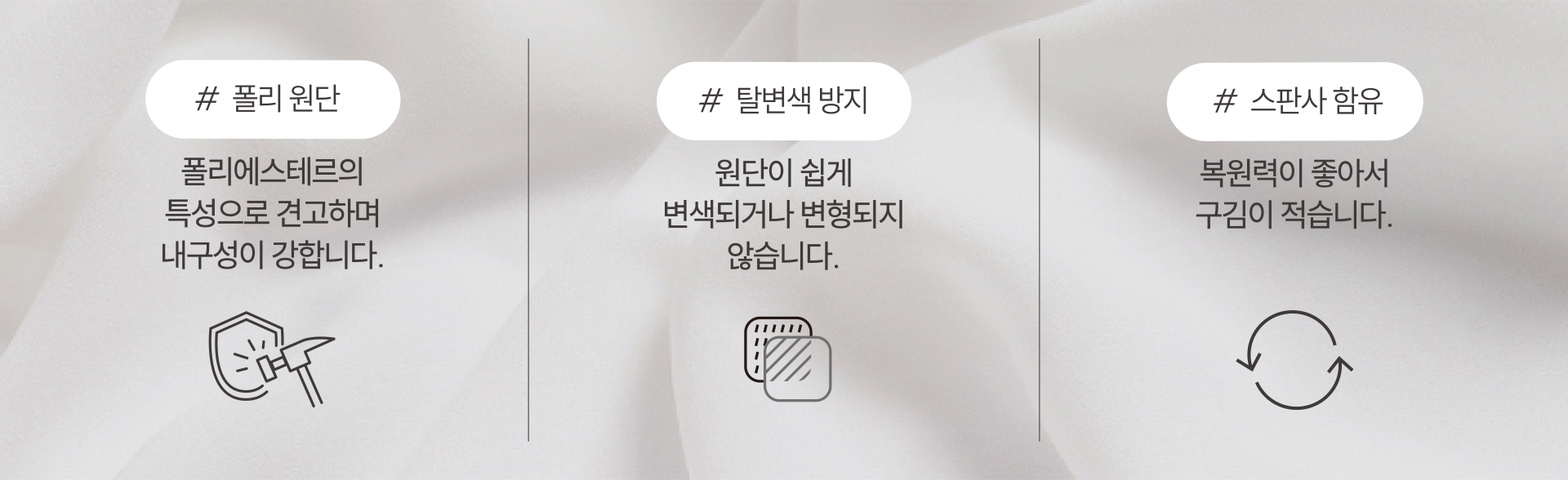 - 은은한 광택감이 느껴지는 잔 트윌 조직의 원단입니다. 구김이 잘 펴져 관리가 편리합니다.