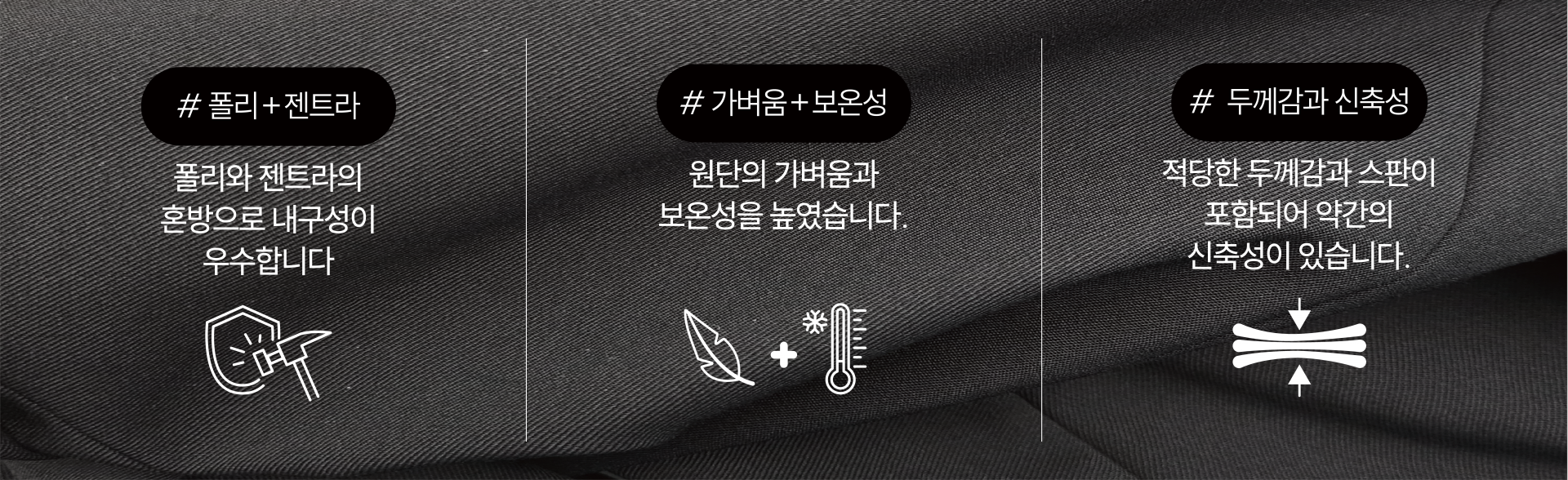 - Fabric - Wool 60%, Polyester 30%, Zentra 10% (젠트라원단사용)