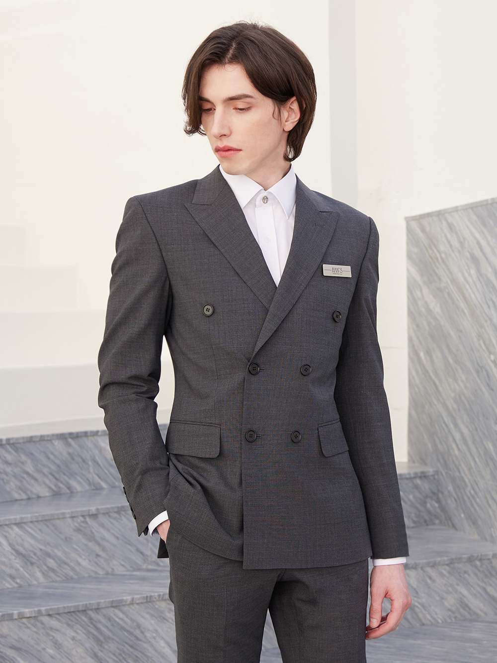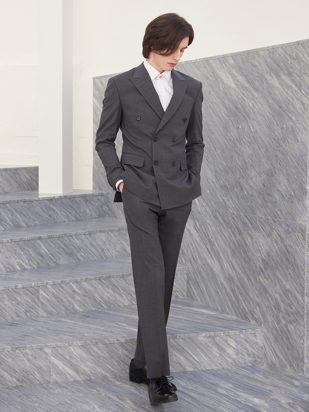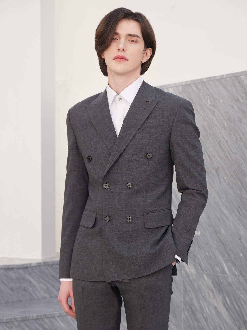 - 클래식한 디자인의 더블 자켓으로, 우아하고 멋스러운 남성의 이미지를 보여줍니다.