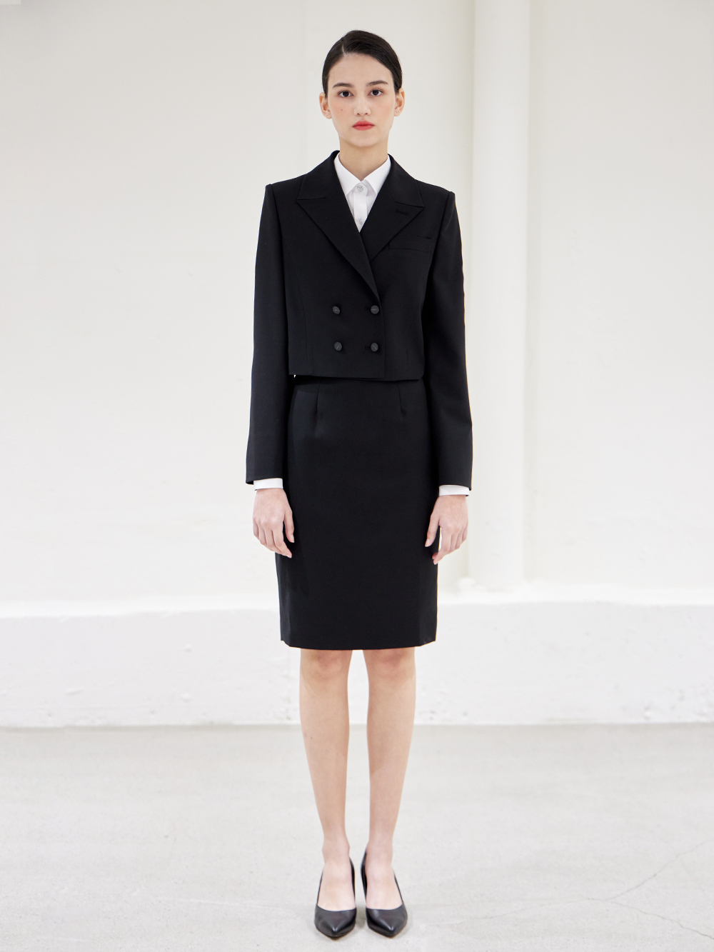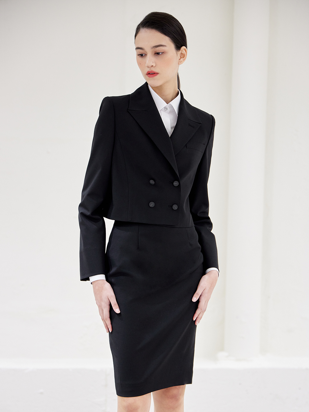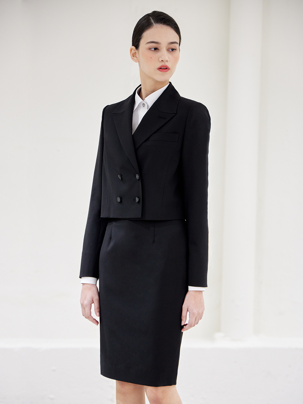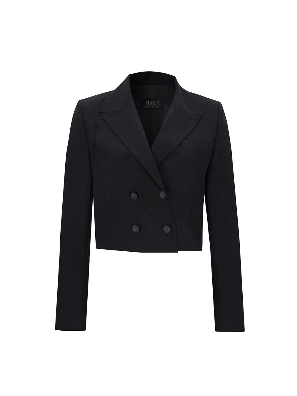 - 숏기장의 베이직한 더블 자켓으로 어깨패드와 함께 깔끔한 핏을 유지해 단정한 분위기를 줍니다.