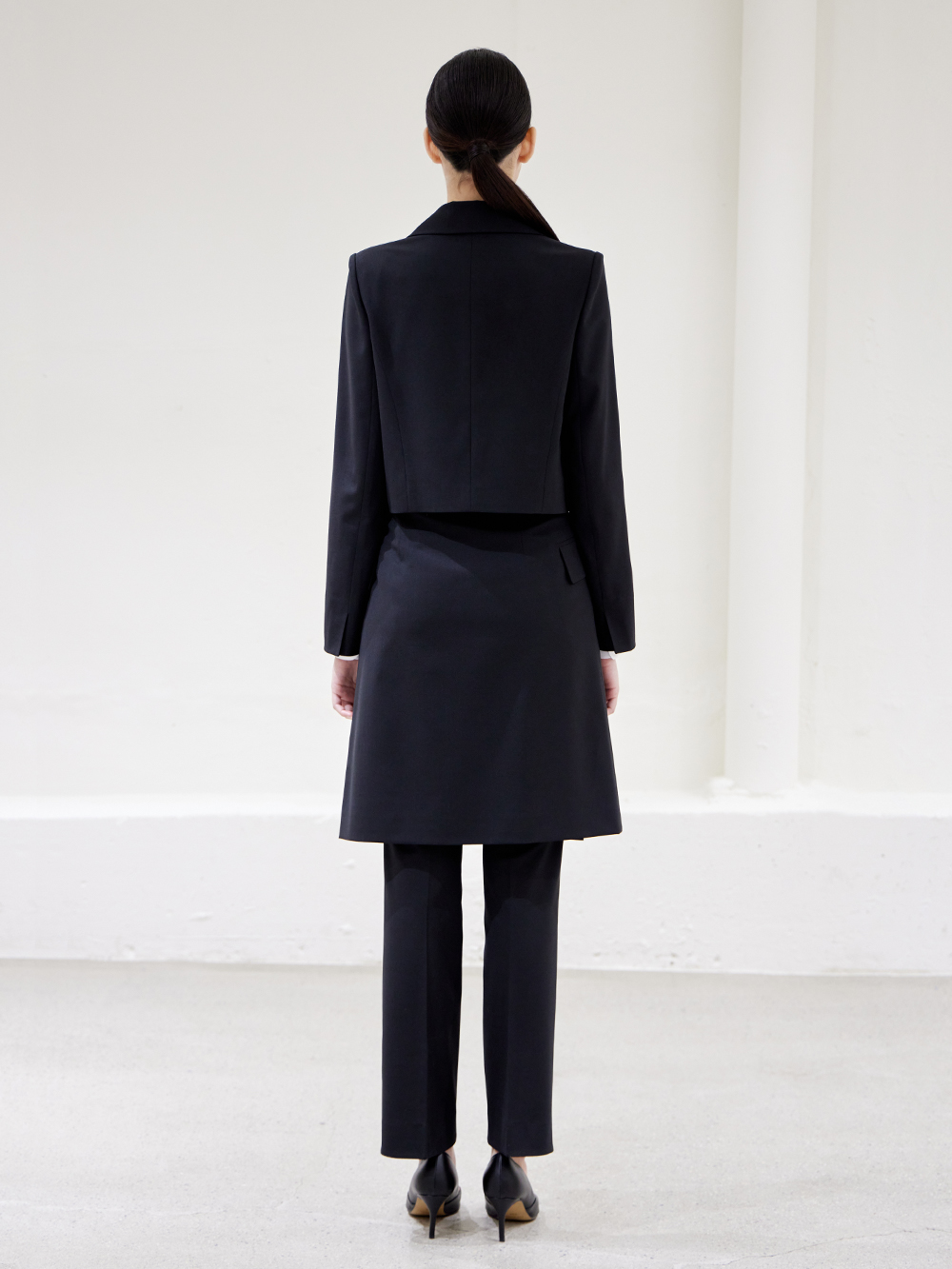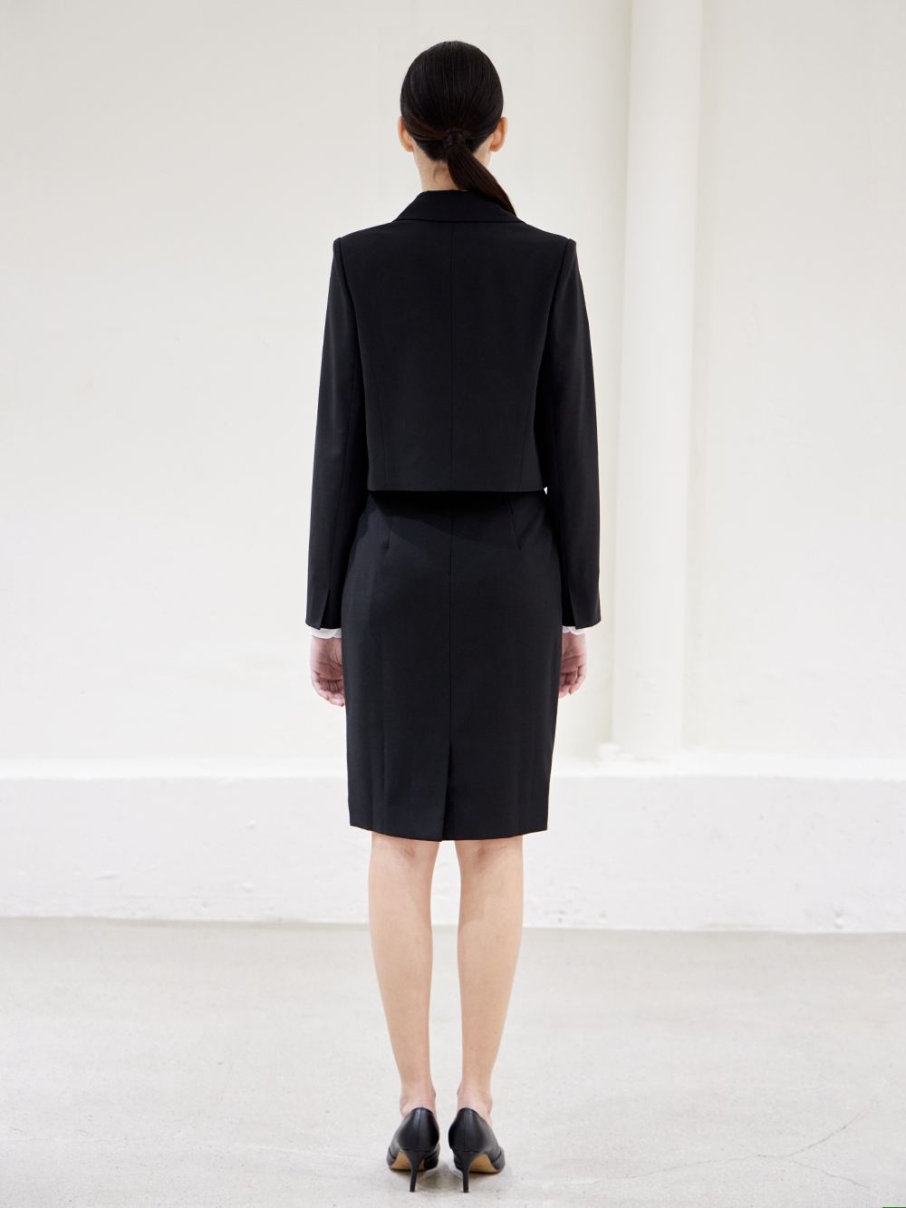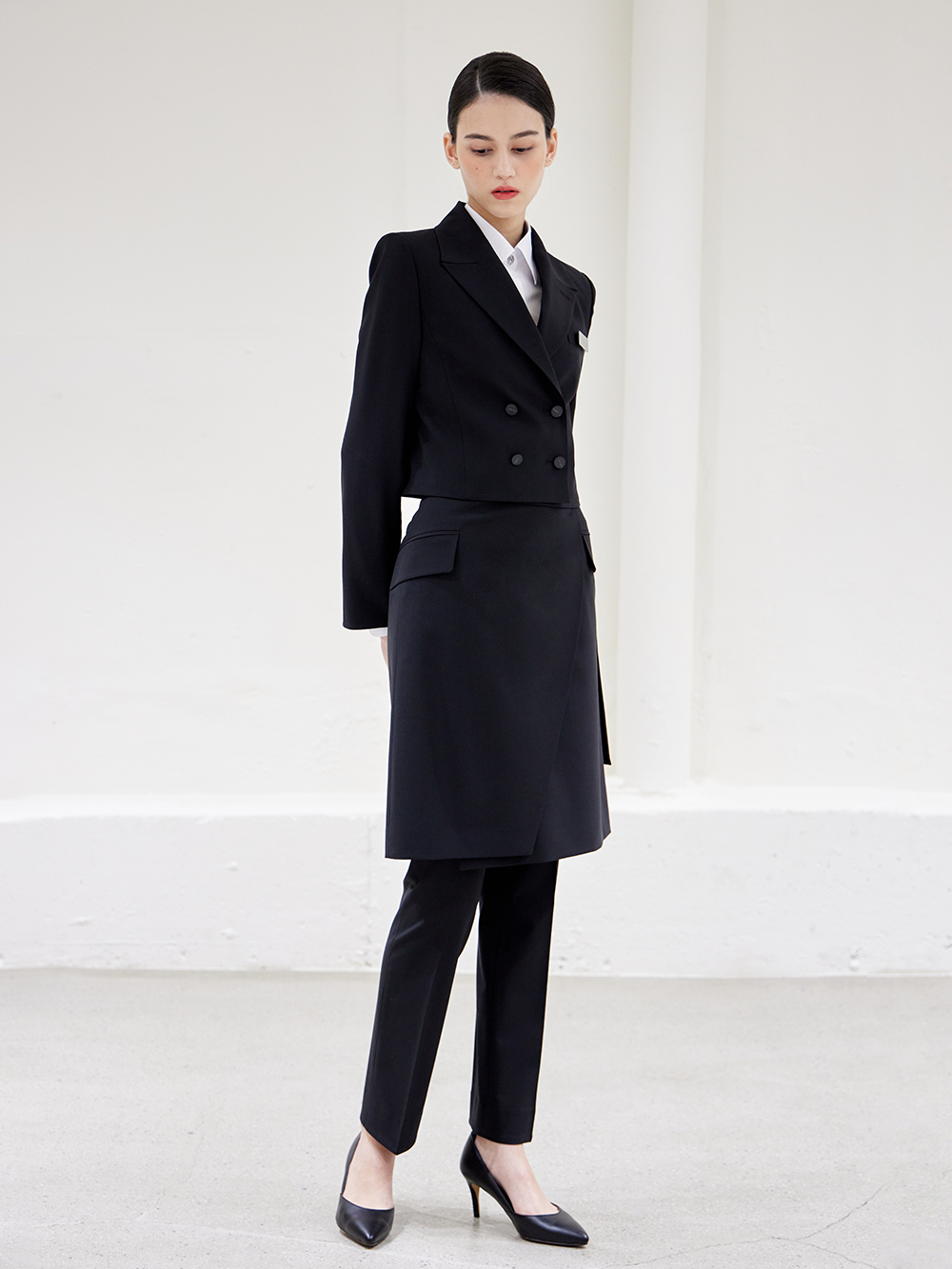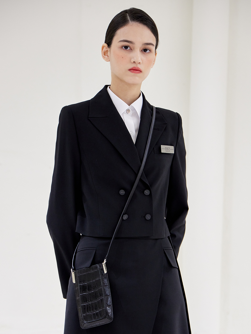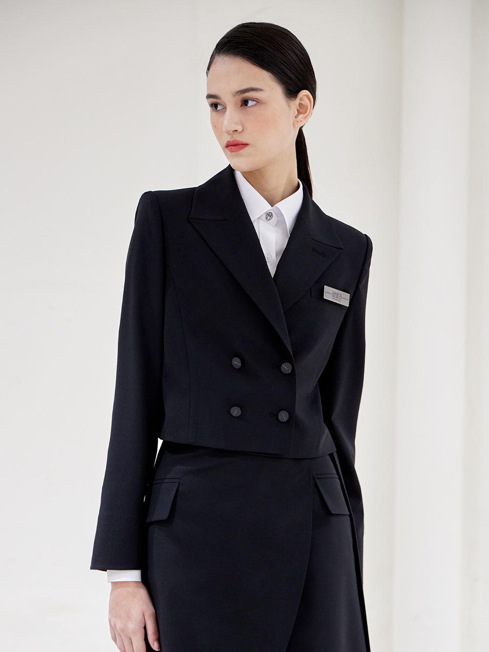 - 숏기장의 베이직한 더블 자켓으로 어깨패드와 함께 깔끔한 핏을 유지해 단정한 분위기를 줍니다.